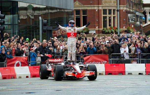 Пилот Формулы-1 Дженсон Баттон позабавил манчестерскую публику виртуозными навыками вождения своего болида.
