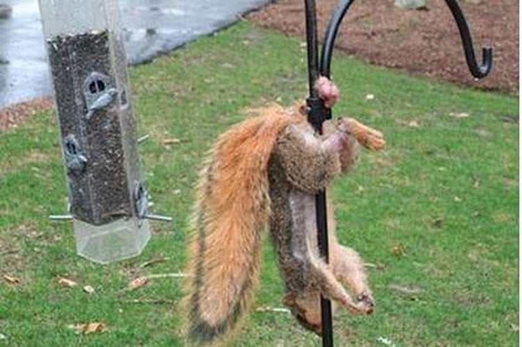 Эта белка явно знает толк в акробатических этюдах. Она хотела полакомиться содержимыми кормушки. Но зацепившись за один из ее вращающихся элементов, совершила эпичный трюк, сама того не подозревая.