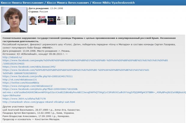 Украинский певец, финалист украинского талант-шоу «Голос.Дети», победитель программы «Хочу к Меладзе», солист российского бойз-бенда «MBAND» Никита Киоссе попал в базу «Миротворца».