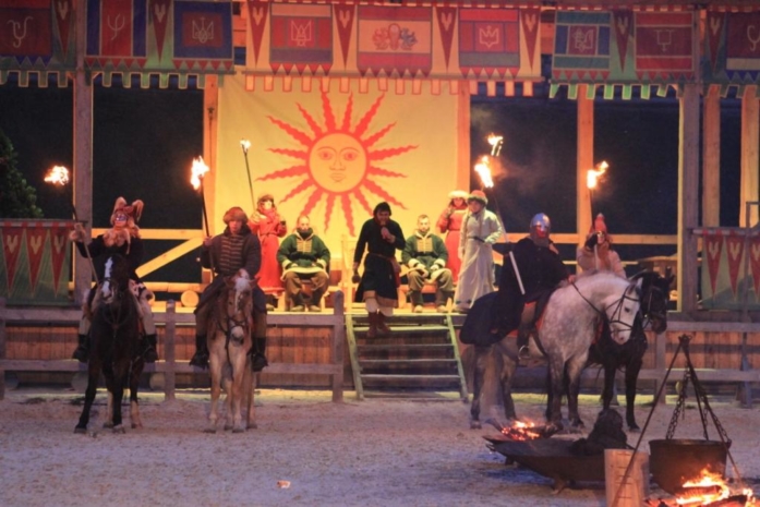 В эти выходные и праздничные дни, 15, 16 и 19 декабря на главном ристалище состоится премьера интерактивного авторского спектакля-мюзикла, который будет интересным и познавательным как для детей, так и для взрослых. Только в Древнем Киеве можно будет услышать воссоздание давно забытого языка – древнеславянского. Ведь постановка будет проходить именно на нем. Спектакль будет сопровождаться огненными спецэффектами, конно-трюковыми выступлениями, использованием средневекового оружия. Зрители смогут не только наблюдать за представлением, но и принять участие в сказочной феерии.