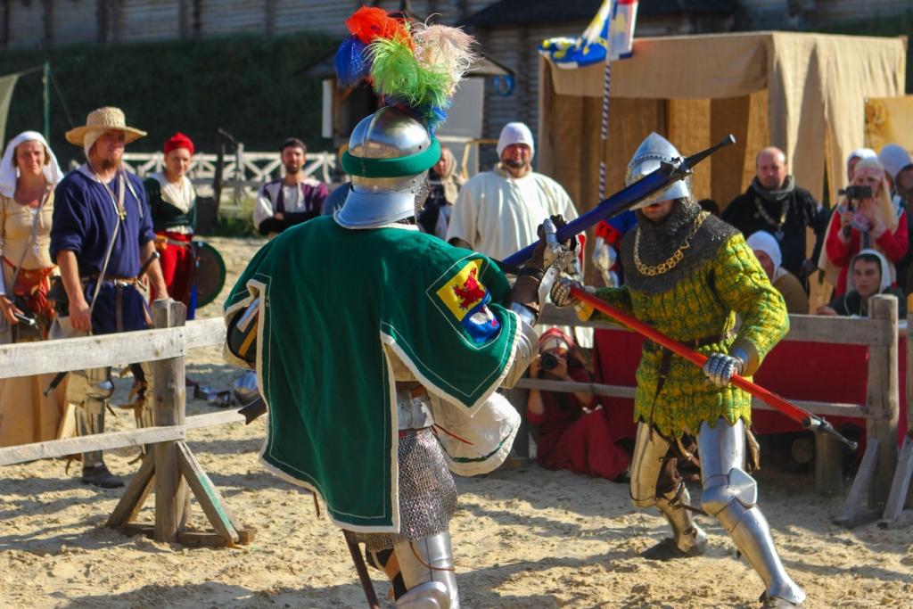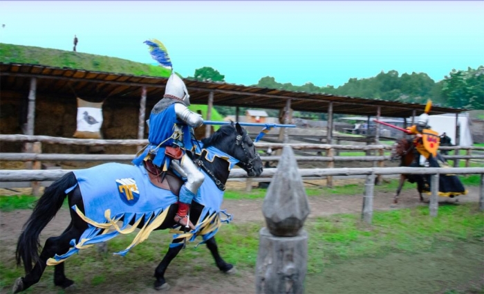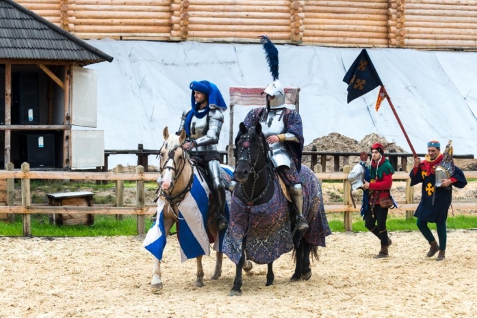 Рыцарские сражения дополнятся выступлениями актеров конно-трюкового театра с захватывающими номерами с элементами джигитовки и строевой подготовки княжеской дружины.
