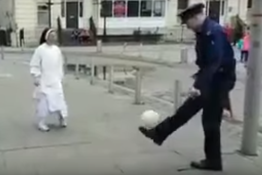Ирландский полицейский О’Коннелл на одной из улиц городка Лимерик сразились в чеканке футбольным мячом с монашкой из собора Святой Девы Марии.