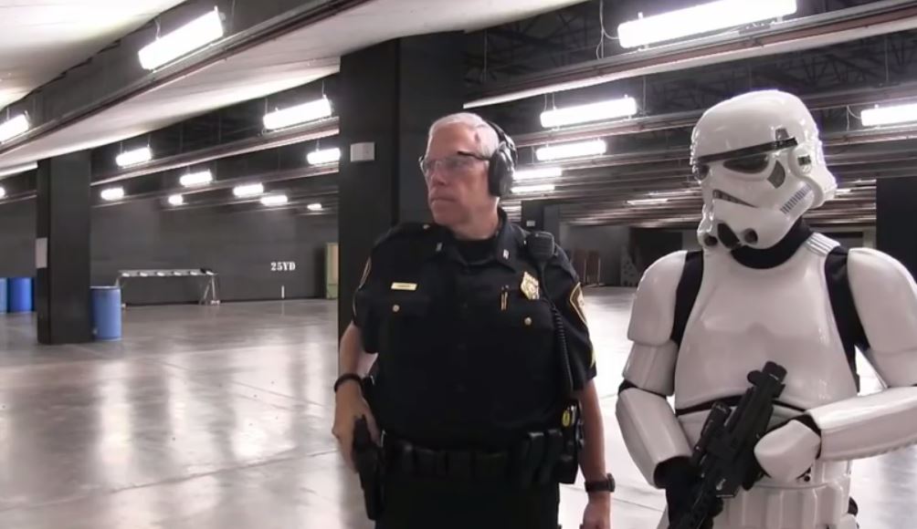 В ролике штурмовик из «Звездных войн» пытается пройти тест для зачисления в класс полицейской академии. Однако стрелять по мишени у него получается откровенно плохо (имперские штурмовики почти всегда стреляют мимо).