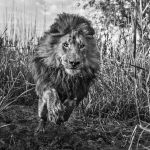 «Я хотел сделать снимок под таким углом, чтобы запечатлеть льва, прыгающего через ручей на другой берег. Для этого мне пришлось прятать оборудование просто в грязную воду. Когда лев достиг противоположного берега, он заметил камеру и набросился на нее. К счастью, снимок чудом уцелел», — вспоминает фотограф.