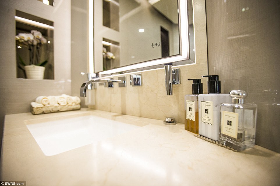 Ванные комнаты в самолете обставлены мебелью из полированного мрамора, массивной дубовой древесины и набором туалетных принадлежностей Jo Malone. Также в каюте есть место для гостей, которые хотят уединиться. Экипаж пентхауса и дворецкие размещаются в отдельных, специально отведенных для этого помещениях.