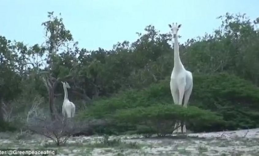 В кенийском заповеднике «Ишакбини» сотрудники организации по охране природы сфотографировали жирафа, у которого абсолютно белый цвет шкуры. Такое явление встречается крайне редко и ранее его не удавалось зафиксировать на видео.