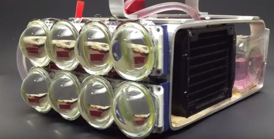 Для изделия он использовал восемь 100-ватных светодиодных чипов, которые все вместе создают световой поток в 72 тысячи люменов (у карманного фонарика этот показатель составляет 500 люменов, у цифровых кинопроекторов, используемых в современных кинотеатрах, — 35 тысяч люменов).