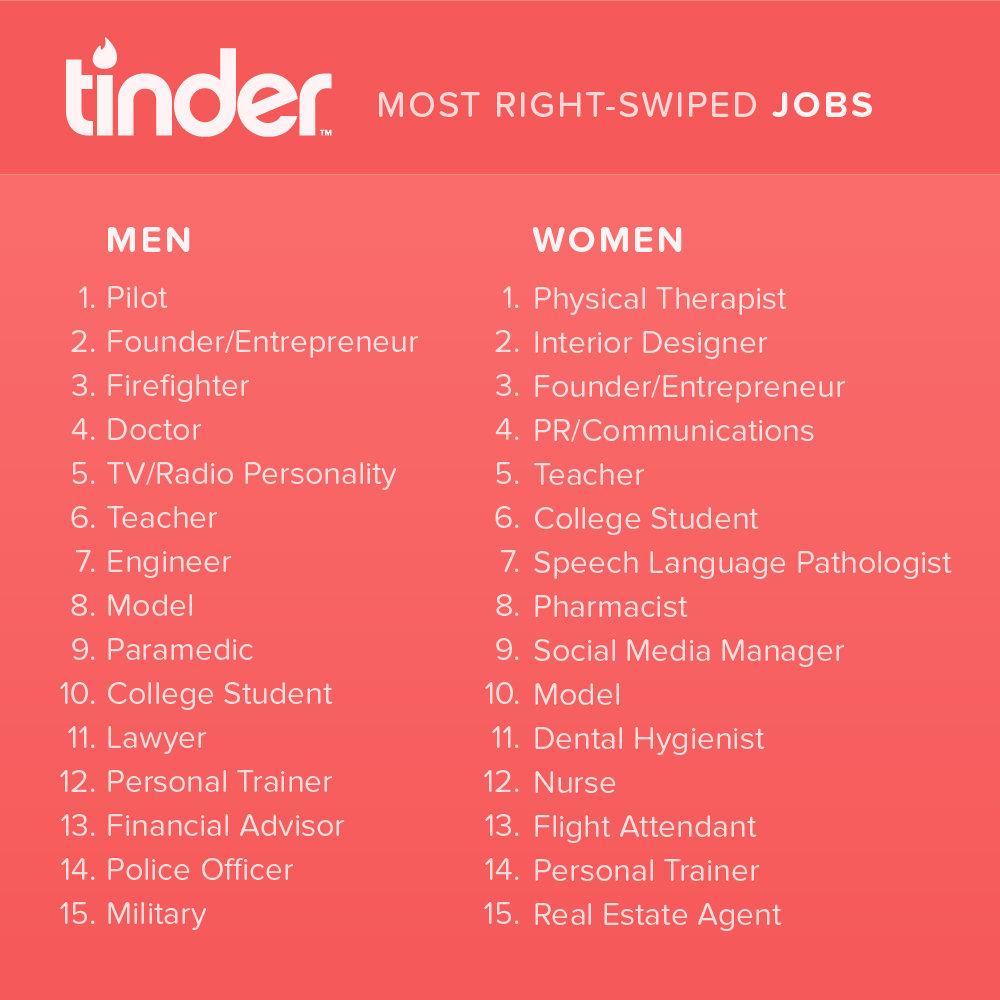 У женщин пользуются популярностью мужчины-пилоты, предприниматели, пожарные, доктора и ведущие на ТВ и радио. Мужчины чаще всего свайпают физиотерапевтов, дизайнеров интерьера, предпринимательниц, пиарщиц и учительниц. Сотрудники модельного бизнеса входят в топ-10, но не на лидирующих позициях.