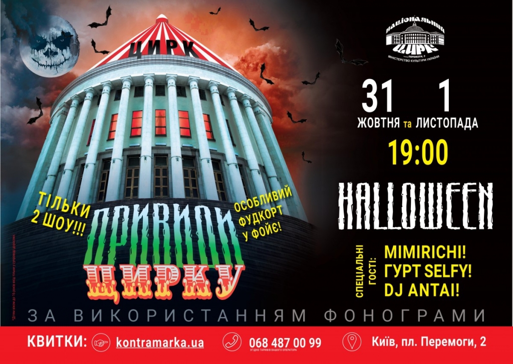 В Национальном Цирке Украины, в канун Хэллоуина, оживут жуткие истории из классических голливудских ужастиков. 31 октября и 1 ноября цирковой мир изменится – в нем будут господствовать устрашающие персонажи, от вида которых всех пришедших станет бросать в дрожь. Марионетки, клоуны, фрики, карлики, силачи в трико, бородатые женщины, воздушные акробаты, чудовищные звуки, игра со светом, словно вы попали во «Freak Circus» в эпоху 19 века, затянут каждого паутиной таинственности. Но вы захотите еще — подобный заряд адреналина можно сравнить лишь с прыжком в бездну. Назад дороги нет — дети, оставленные без присмотра, станут собственностью цирка!