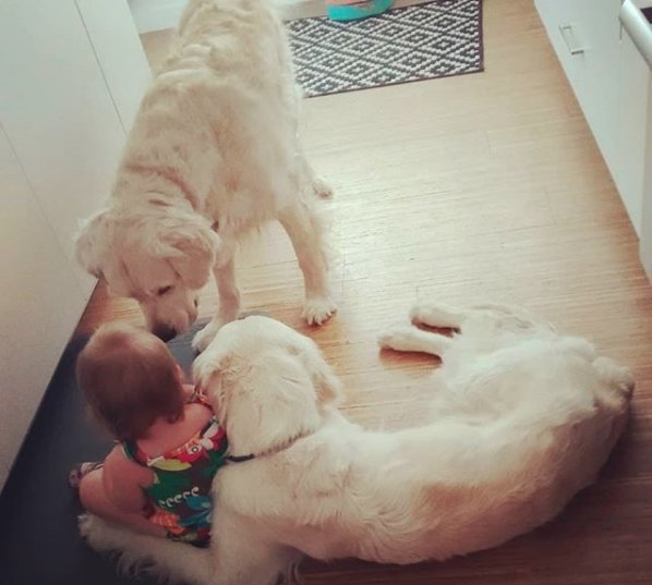 Родители малышки не смогли понять, как их дочь покинула свою комнату. Ведь вечером они закрыли плотно дверь, но, просмотрев записи камеры наблюдения, родители с удивлением обнаружили, что два золотистых ретривера открыли дверь в детскую комнату врано утром, приглашая свою маленькую хозяйку покорить их.