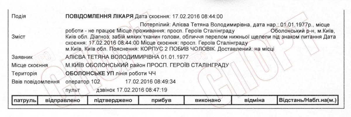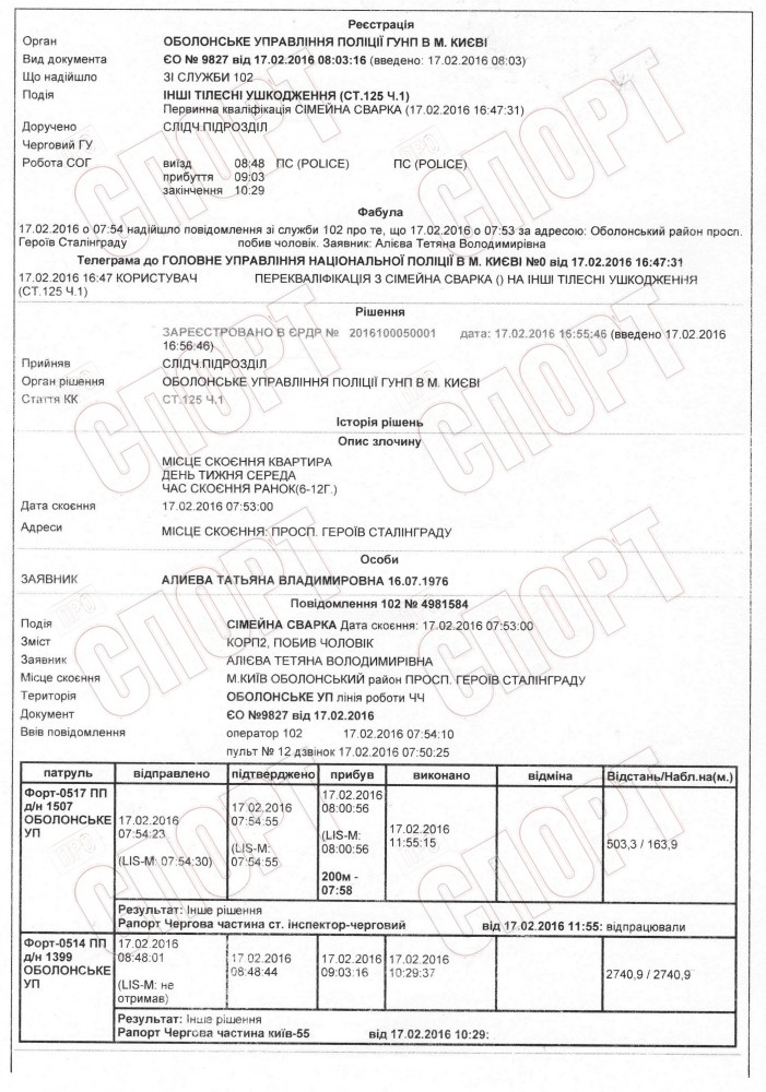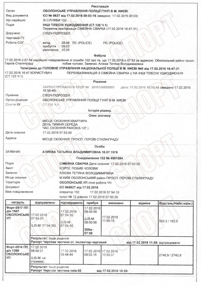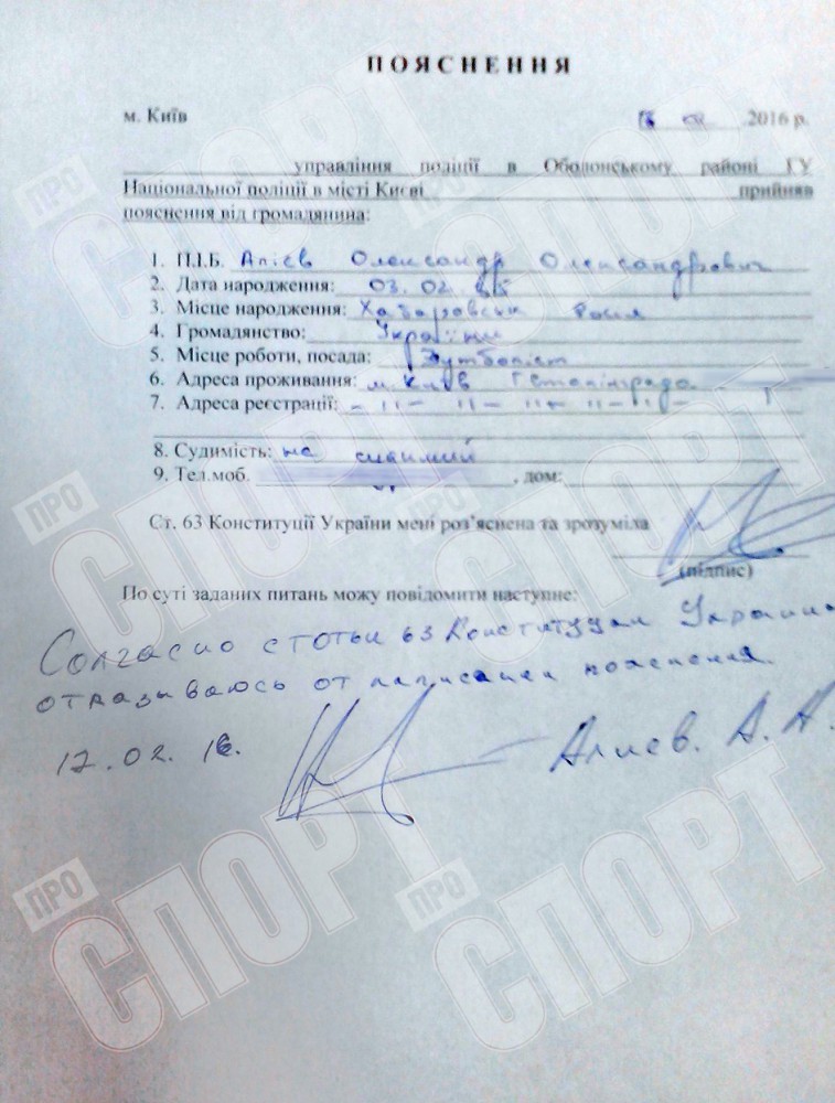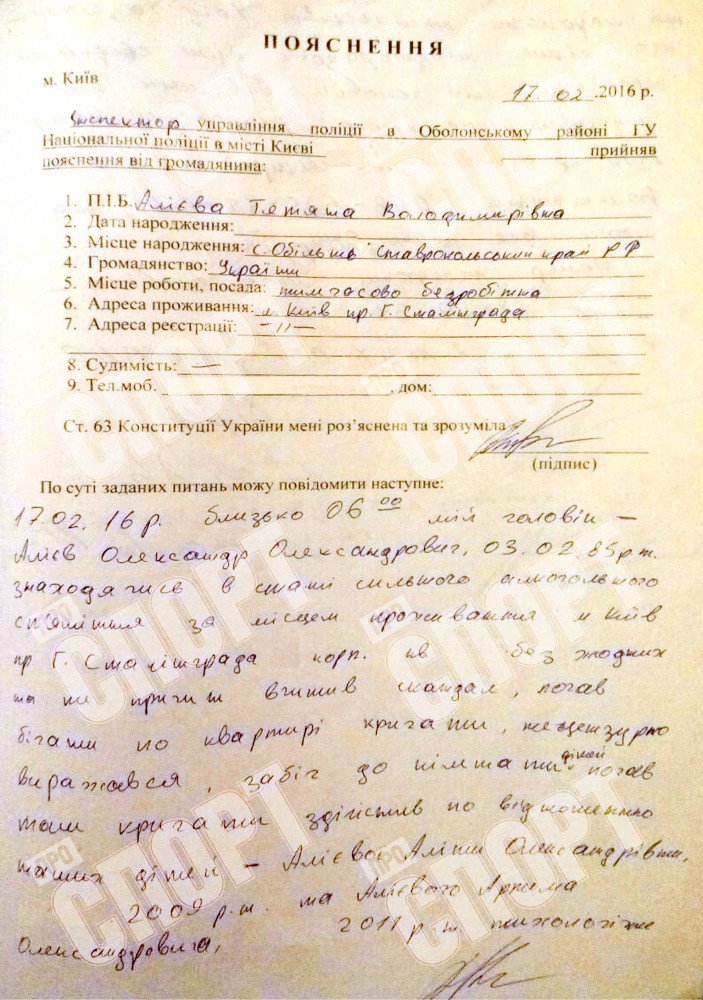 СМИ получило фото протокола задержания футболиста и объяснений его жены. Экс-игрок «Динамо» и сборной Украины Александр Алиев в состоянии алкогольного опьянения избил свою жену Татьяну. Его доставили в участок, где составили протокол, фото которого оказалось в распоряжении издания.