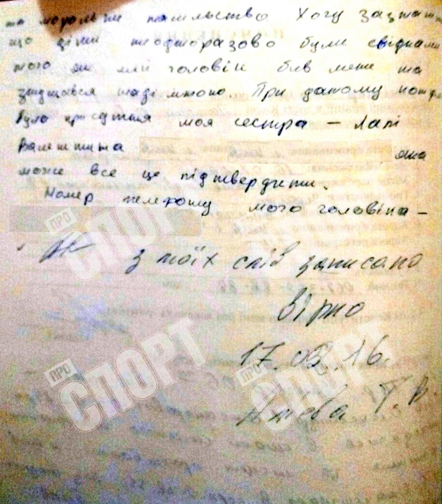 Также ТСН Проспорт получил фото объяснений пострадавшей. В нем говорится о том, что Алиев был в состоянии алкогольного опьянения.