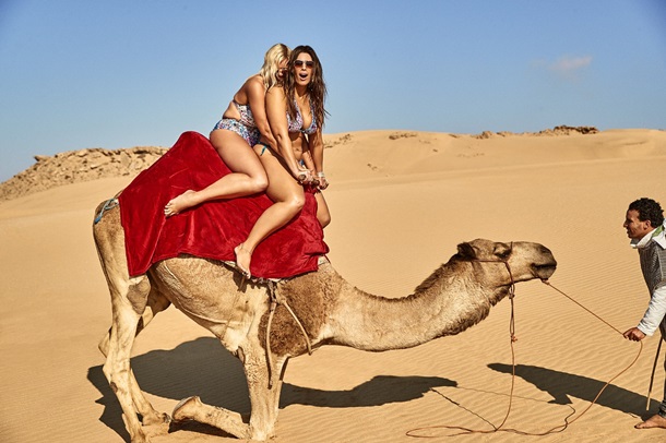 Съемка прошла в пустыне. Женщины позировали в купальниках похожих фасонов или цветов. В линейке представлены как раздельные модели с бикини, так и сдельные купальники.