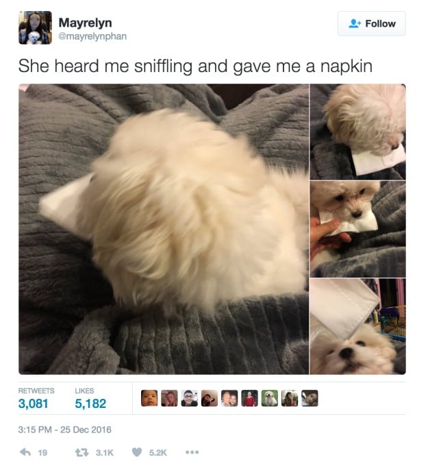 Добрый пёс по кличке Ловелас принёс своей хозяйке салфетки, когда увидел, что она плачет. По словам хозяйки Мейрелин Фан, её пробило на слезу, когда она смотрела телешоу «The OA». Салфетки лежали в той же комнате, где стоял и телевизор. И пёс сразу же взял их зубами и принёс девушке.