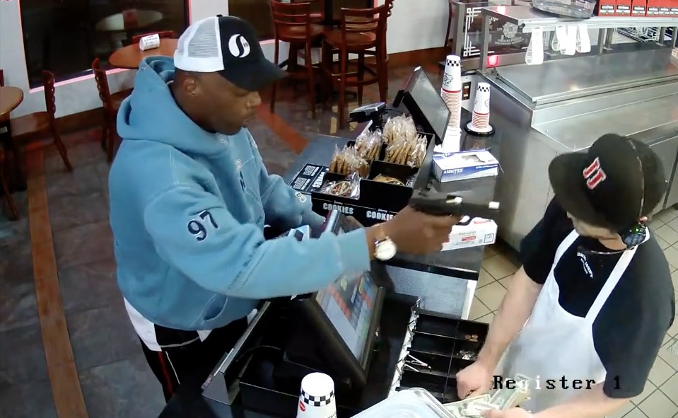 На кадрах видно, как злоумышленник сначала что-то заказывает, но после достает пистолет и угрожает им кассиру.