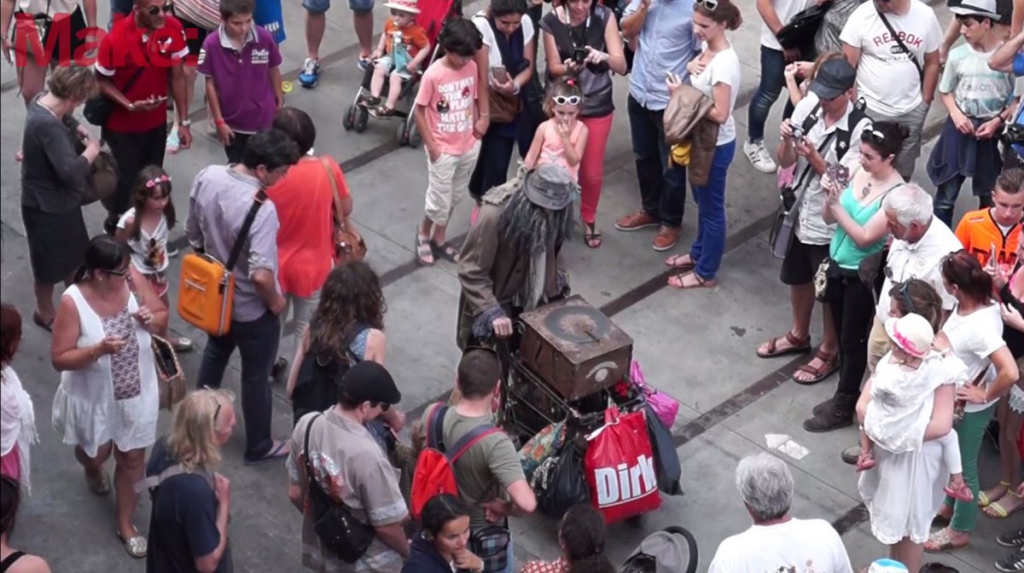 Ярмарка в Нанте — не первый фестиваль, на котором появился Дирк. Абелс привозил его на Ars Electronica-2010 в Австрии, карнавал в Рио-де-Жанейро в 2013 году и многие другие массовые мероприятия. Он заметил, что взаимодействие людей с роботом, как правило, происходит в три этапа. Сначала они думают, что это настоящий бездомный человек. Большинство людей стараются отойти от него подальше, и это, по словам изобретателя, иллюстрирует отношение общества к нищим людям. Если же кто-то даёт ему деньги, Дирк начинает крутить шарманку и звучит короткая мелодия. В этот момент люди чаще всего догадываются, что перед ними робот. А внимательно понаблюдав за его действиями, зрители начинают искать того, кто им управляет.