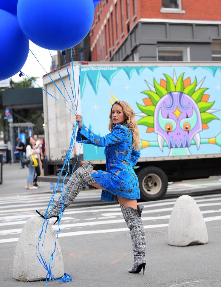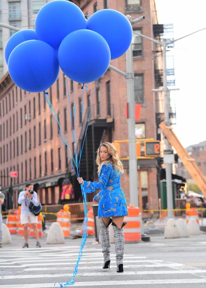 Певица Рита Ора отправилась на Манхэттен ради съемок нового клипа. Папарацции застукали звезду на улице Нью-Йорка в черном купальнике, а также коротком синем платье-пальто и ботфортах.