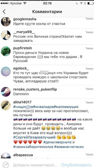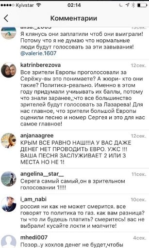 «Зашла в Инстаграмм Джамалы, в комментариях столько яда выплеснуто от россиян, перешла из-за интереса к Лазареву — один комментарий от украинки : «Все честно Джамала лучшая», — написала она.