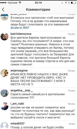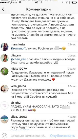 «Зашла в Инстаграмм Джамалы, в комментариях столько яда выплеснуто от россиян, перешла из-за интереса к Лазареву — один комментарий от украинки : «Все честно Джамала лучшая», — написала она.