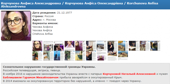 Чехова находится в базе «Миротворца» по причине незаконного пересечения украинской границы при посещении аннексированного Крыма.
