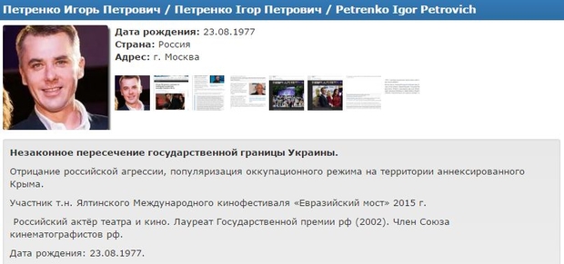 Кроме незаконного посещения Крыма Игорю Петренко также выдвигается обвинение в отрицании российской агрессии против Украины. «Водитель для Веры наконец-то нашел место там, где ему комфортно. И это место — Чистилище. Для него — самое то. Родился в Германии (и кто тут хвашист?). В 15 лет попал в тюрьму за участие в убийстве. Получил 8 лет. (Внимание!!! Условно.) Только в 20 лет закончил школу», — пишет «Миротворец».