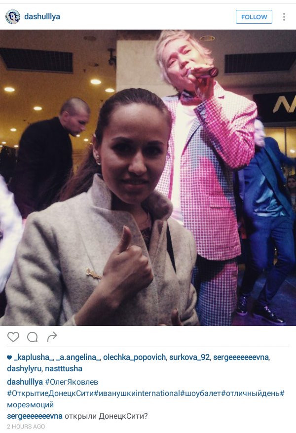Экс-солист группы «Иванушки», а сейчас сольный певец Олег Яковлев приехал в оккупированный Донецк ради того, чтобы принять участие в развлекательной программе, посвященной открытию местного ТРЦ «Донецк-Сити». Об этом сообщает «Остров».
