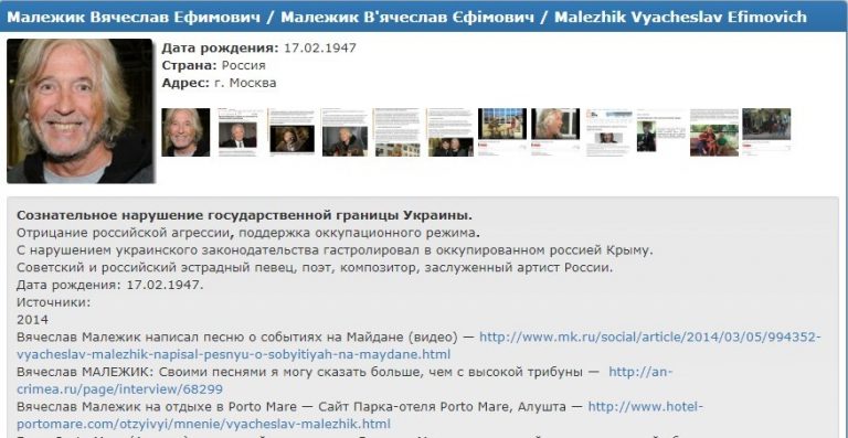 Российский певец Вячеслав Малежик, оказавшийся в списках «Миротворца», дал интервью изданию «Московский комсомолец». Отвечая на вопрос о своем присутствии в украинском «черном списке» Малежик внезапно признался в любви Украине.
