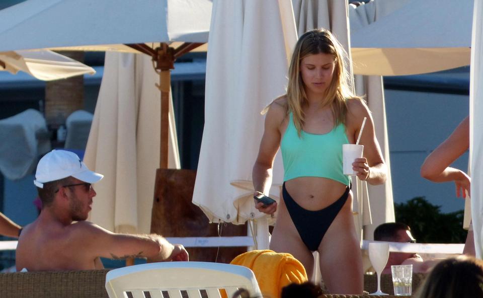 Эжени надела эффектный купальник, состоящий из черных бикини и голубого топа. Компанию на отдыхе ей составила подруга и бойфренд и хоккеист Джордан Карон.