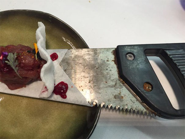 Ресурс Bored Panda составил подборку самых странных блюд в ресторанах. Некоторые повара в своих попытках выделиться среди конкурентов доходят до абсурда. Они нашпиговывают грибы на колючую проволоку, выкладывают красные деликатесы на гигиенические прокладки, подают клубнику на стульях и яичницу на лопатах, в кедах, зонтах или просто на камнях. От одного своего внешнего вида эти кулинарные конструкции могут отбить аппетит. Однако некоторые ценители экстравагантной кухни высоко оценивают такой креатив.