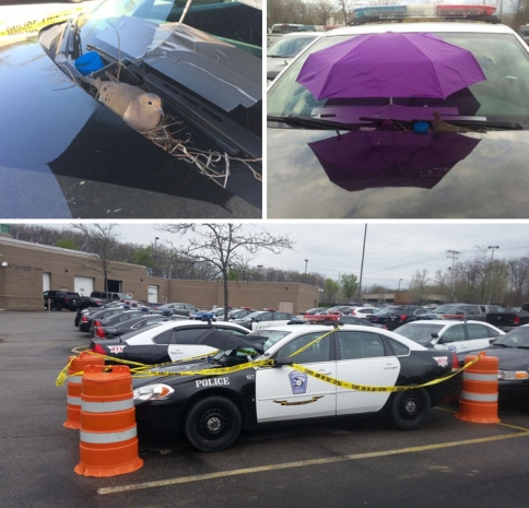 Голубка сплела гнездо и снесла яйца на кузове полицейского автомобиля. Правоохранители накрыли гнездо зонтом и оградили парковочное место.
