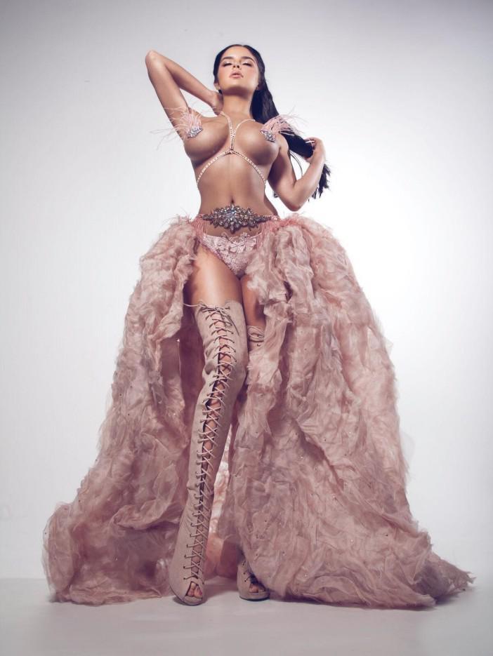 Известная модель и обладательница титула «самый сексуальный DJ» Деми Роуз, прославившаяся благодаря своим формам, решила выпустить коллекцию бикини специально для девушек с крутыми бедрами и объемными ягодицами. Она предстала перед подписчиками в сногсшибательном розовом наряде, состоящем из бикини и объемной юбки. Деми позирует топлесс, а ее соски венчают украшения из страз и перьев.