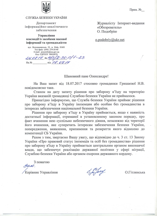 «На ваш запрос от 18.07.2017 по гражданке Гришаевой Н.В. сообщаем следующее. По состоянию на дату запроса указанной гражданке решение о запрете по въезду на территорию Украины не выносилось», — ответили в СБУ.