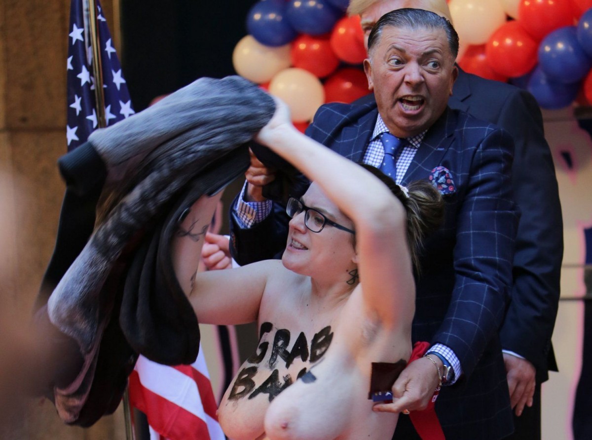 «Хватай патриархальность за яйца!» — выкрикивала девушка, хватая манекен между ног. Эти же слова были написаны у неё на спине. Таким образом, активистка выразила свой протест против пренебрежительных высказываний Трампа в сторону женщин.