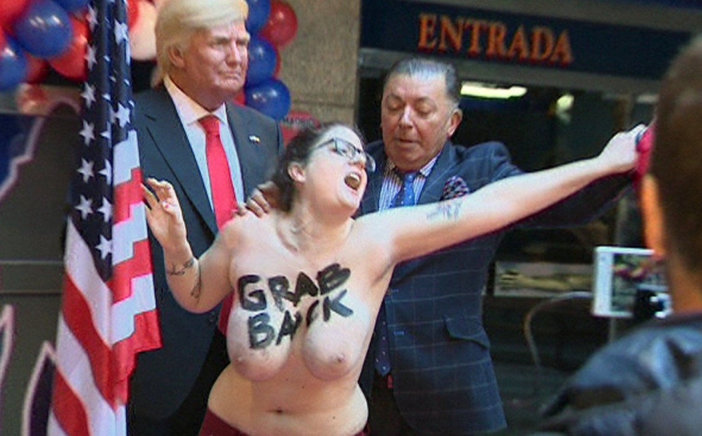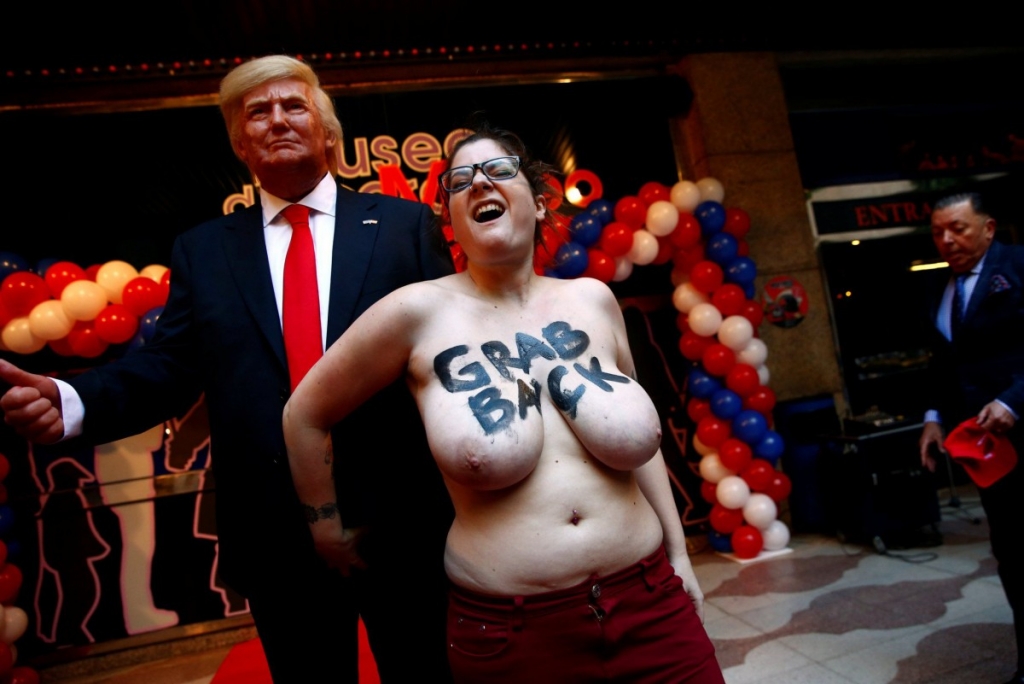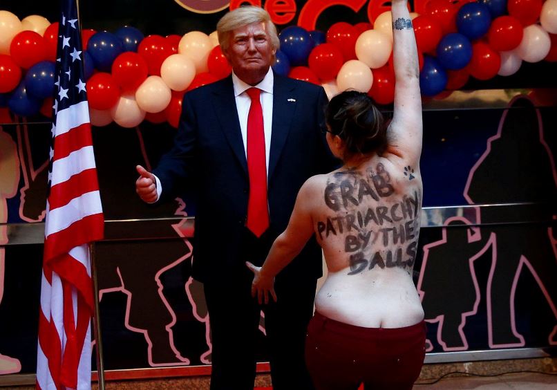 «Хватай патриархальность за яйца!» — выкрикивала девушка, хватая манекен между ног. Эти же слова были написаны у неё на спине. Таким образом, активистка выразила свой протест против пренебрежительных высказываний Трампа в сторону женщин.