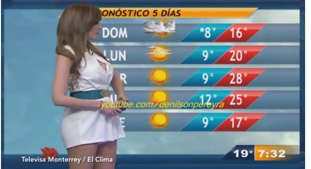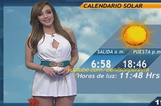 Мексиканская ведущая погоды Габби Лозоя впечатлила зрителей передачи о прогнозе погоды своим экстремально коротким платьем. Все желающие смогли легко рассмотреть под нарядом нижнее белье журналистки.