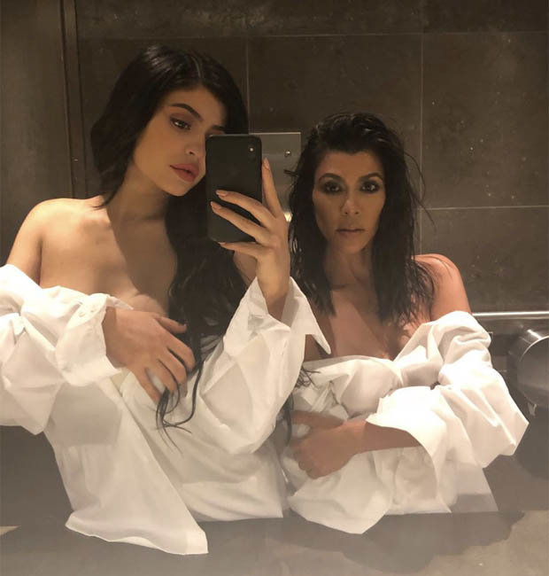 Сестры Кайли Дженнер и Кортни Кардашьян показали снимок топлесс. Они позируют с приспущенными халатами и влажными волосами у зеркала.