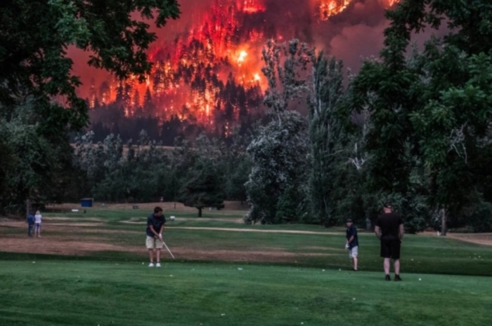 Пользователь сети Reddit под ником Kolsefur выложил снимок, который показывает людей, играющих в гольф на фоне лесного пожара. Ещё одно фото с этого же места во время стихии выложило издание Golf Digest.