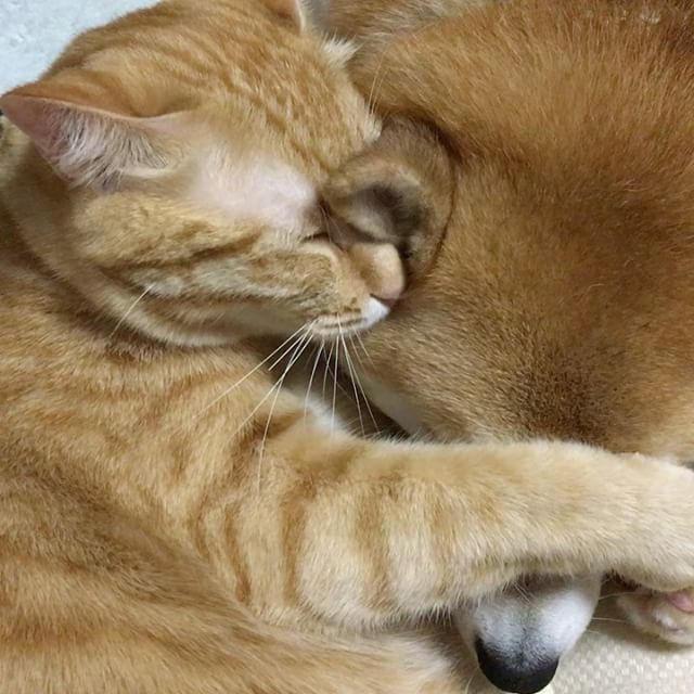 Пятилетний сиба-ину по имени Гаку живет в Японии вместе с двумя кошками — Ринрин (ей тоже пять лет) и годовалым Тораджиро. С рыжим Тораджиро Гаку особенно подружился: пес и кот часто лежат в обнимку и вылизывают друг другу уши.
