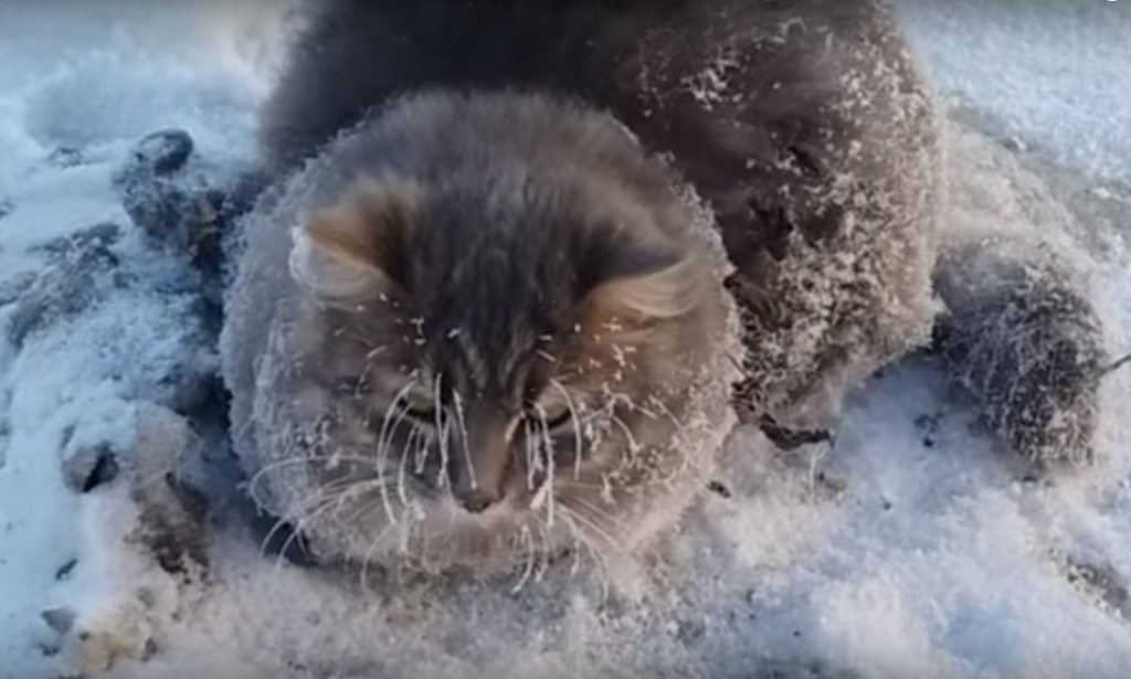 Больше 250 тыс. просмотров только на Youtube собрало видео, в котором показывается спасение замёрзшей кошки. Животное примёрзло лапами к земле, отчего людям пришлось растапливать лёд горячей водой.