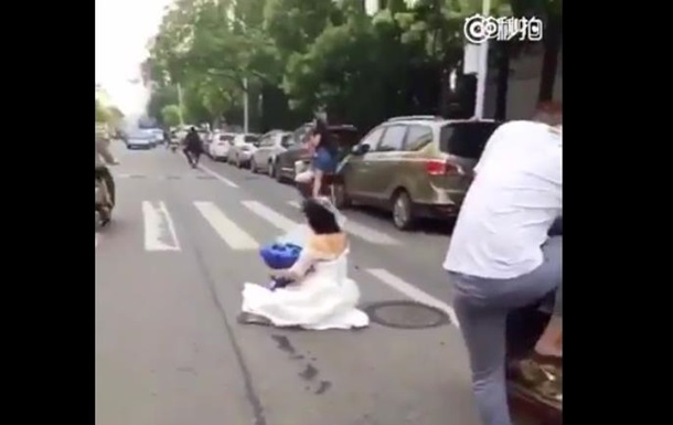 На странице Peopleʼs Daily Online опубликовали видео с молодоженами, которые едут на скутере — судя по всему, со свадьбы. Когда скутер переезжал через «лежачего полицейского», невеста не удержалась и упала на асфальт. Жених не заметил этого и поехал дальше.