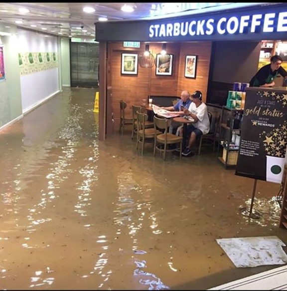 Район Чхайвань, где располагается кафе, затопило из-за сильных ливней, которые идут в Гонконге на протяжении нескольких дней. В начале недели в городе выпадало по 70 миллиметров осадков в час.