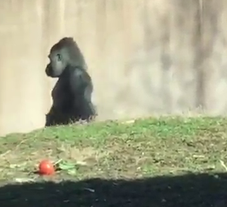 227-кг примат, зажав в руке томат, разгуливал по территории. Смотрители считают, что таким образом он не хотел пачкать передние лапы, которыми ест.