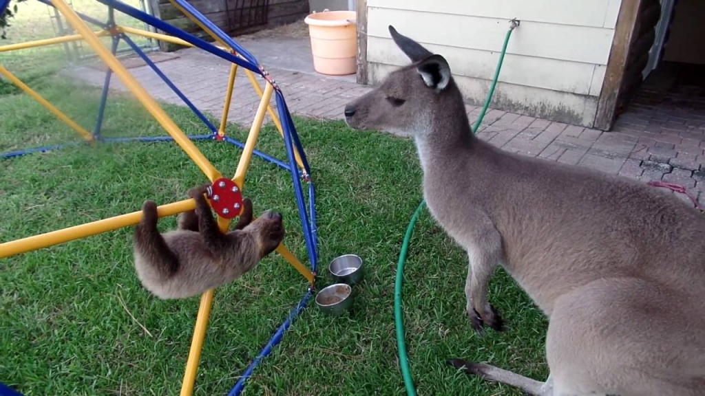 Сеть умилил дружелюбный ленивец, желающий поиграть с кенгуру