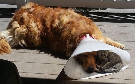 Где и когда именно были сделаны фотографии, не уточняется. На снимках можно увидеть грустного пса в защитном воротнике, внутрь которого забрался котенок.