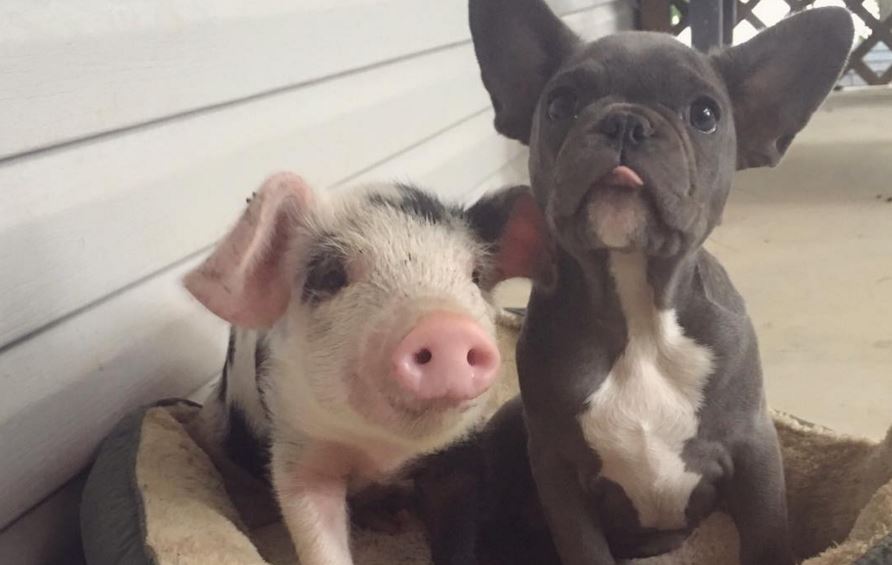 Щенка зовут Кива, поросенка – Пинат. У их хозяев также есть свинья Пайпер, с которой маленький бульдог пока не очень хорошо ладит.