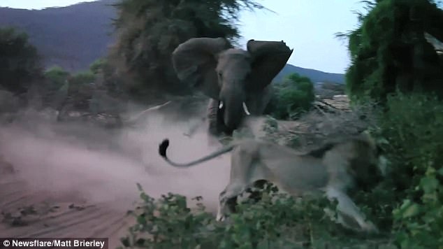 Инцидент снял в кенийском заповеднике Самбуру британец Мэтт Брирли, специализирующийся на съемках дикой природы. Оператор запечатлел, как на маленького слоненка, идущего за матерью, неожиданно прыгнул лев. Однако слониха мгновенно издала рев, бросилась на хищника и прогнала его.
