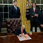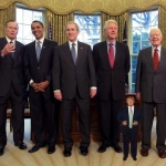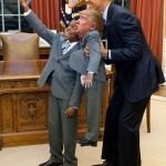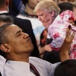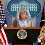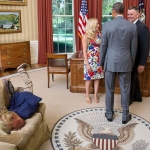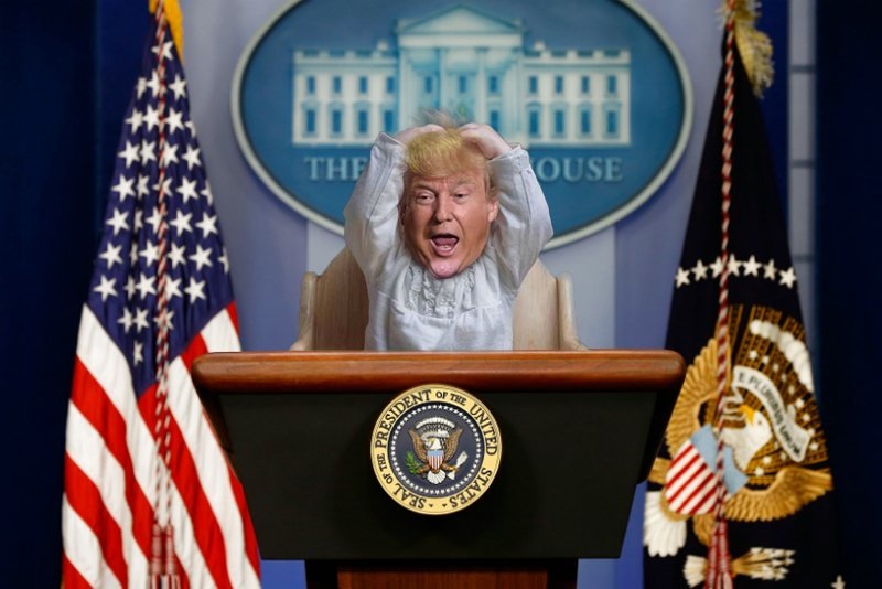 Также он забавно сидит на стуле и у него свисают ножки, рисует каляки-маляки на государственных бланках, ходит за ручку с другими чиновниками и капризничает, сидя на руках у Барака Обамы или Иванки Трамп. На данный момент в сети опубликовано уже несколько десятков таких карикатур.