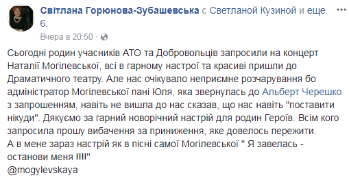«По поводу этого досадного инцидента сообщаем, что в связи с неполной продажей билетов на концерт 28 декабря 2017, администраторы певицы Могилевской, которые обеспечивали наполняемость зала, пригласили на свободные места членов семей участников АТО, не учитывая количество желающих попасть на концерт народной артистки Украины Натальи Могилевской. Как результат, значительное количество людей, которые откликнулись на приглашение бесплатно посетить концерт, не смогли попасть в театральный зал из-за нехватки свободных мест», — прокомментировали в театре, передает «ЧЕline».