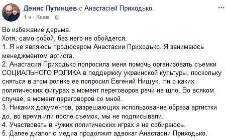 Впрочем, у Нищука не открещивались от слов певицы и подтвердили, что она соглашалась сняться в «условном видео-ролике». «Действительно, разговор Евгения Николаевича с госпожой Анастасией была относительно просто принципиального согласия в съемках условного видео-ролике. Ведь это сфера культуры, а они являются знакомыми и имеют контакты друг друга. Все дальнейшие переговоры велись продюсерами ролика с одной стороны и продюсером певицы Денисом Путинцева с другой стороны, который был проинформирован о содержании съемок и способствовал их проведению», — говорится в заявлении.