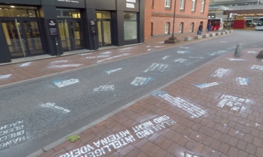 Уязвленный этим художник собрал 30 самых оскорбительных твитов, сделал из них трафареты для граффити и ночью нанёс из перед главных офисом социальной сети в Гамбурге.